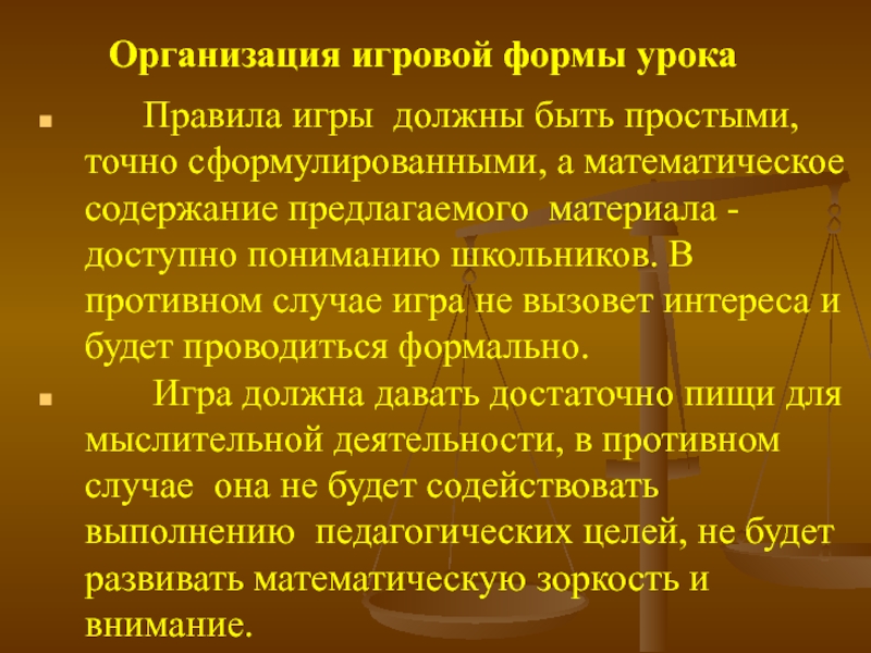 Организация игровой формы урока   Правила игры должны быть простыми, точно сформулированными, а математическое содержание предлагаемого