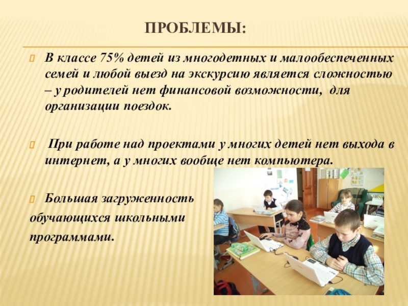В классе 75% детей из многодетных и малообеспеченных семей и любой выезд на экскурсию является сложностью – у родителей нет финансовой возможности, для организации поездок.