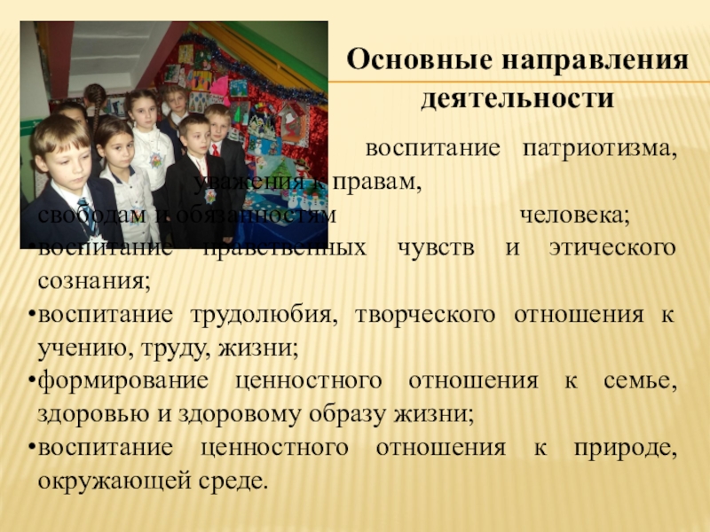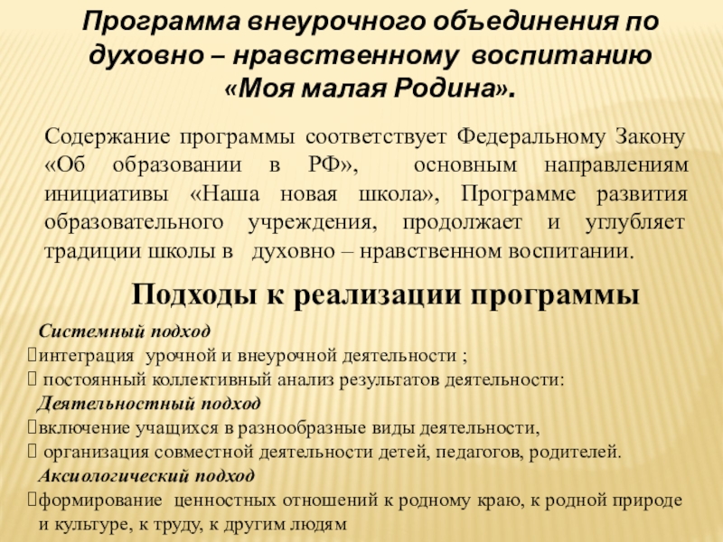 Содержание программы соответствует Федеральному Закону «Об образовании в РФ», основным направлениям инициативы «Наша новая школа», Программе развития образовательного учреждения, продолжает и углубляет традиции школы в духовно – нравственном воспитании.