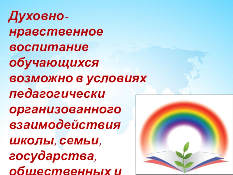 Слайд 24Духовно-нравственное воспитание обучающихся возможно в условиях педагогически организованного взаимодействия школы, семьи,