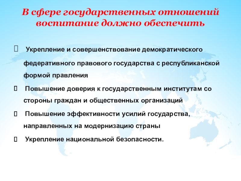 Слайд 6В сфере государственных отношений воспитание должно обеспечить