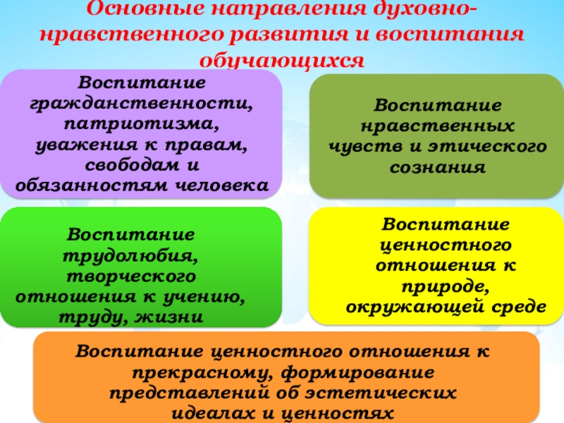 Слайд 17Основные направления духовно-нравственного развития и воспитания обучающихся