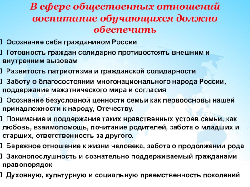 Слайд 5В сфере общественных отношений воспитание обучающихся должно обеспечить