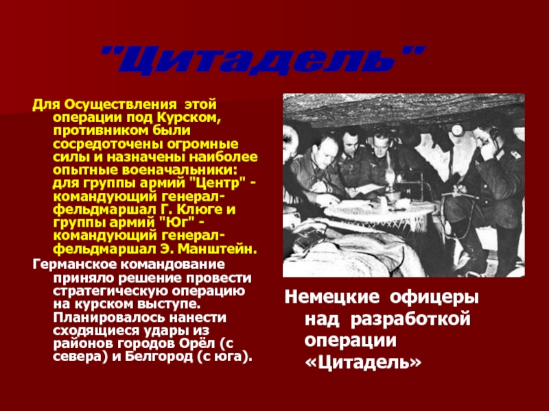 Немецкий план операции «Цитадель» предусматривал «срезать» Курскую дугу ударами немецких войск с севера и с юга, окружить советские войска и уничтожить их.