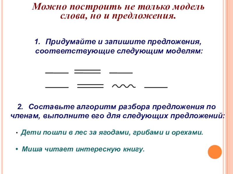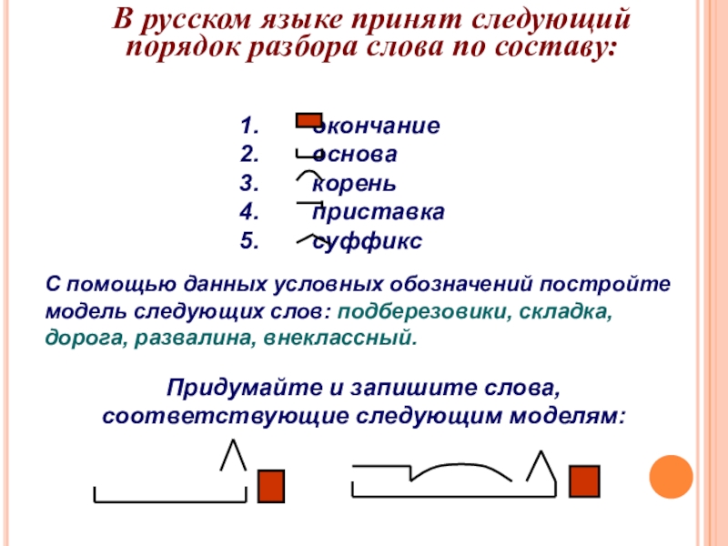 С помощью данных условных обозначений постройте модель следующих слов: подберезовики, складка, дорога, развалина, внеклассный.