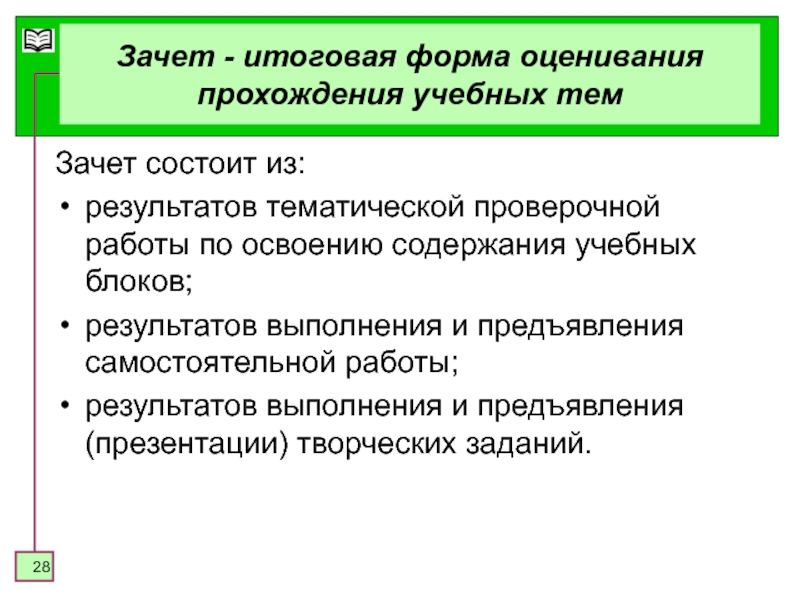Слайд 28Зачет - итоговая форма оценивания прохождения учебных тем
