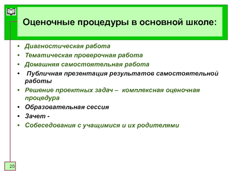 Слайд 25Оценочные процедуры в основной школе: