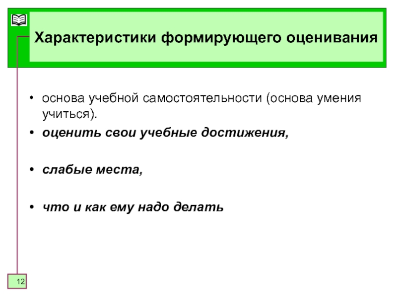 Слайд 12Характеристики формирующего оценивания