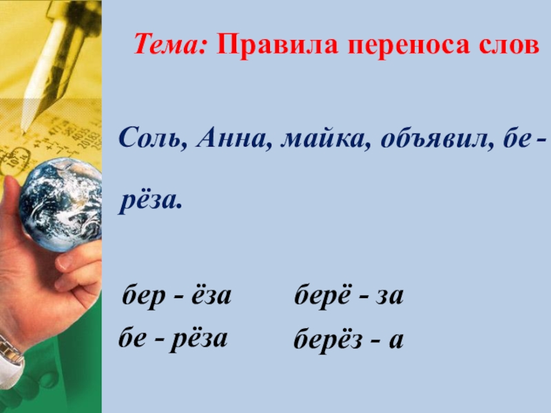 Соль, Анна, майка, объявил, бе-рёза.бер - ёзабе - рёзаберё - заберёз - аТема: Правила переноса слов