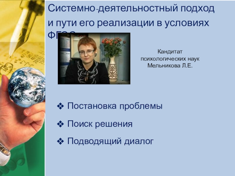 Системно-деятельностный подход и пути его реализации в условиях ФГОСКандитат  психологических наук Мельникова Л.Е.Постановка проблемыПоиск решенияПодводящий диалог