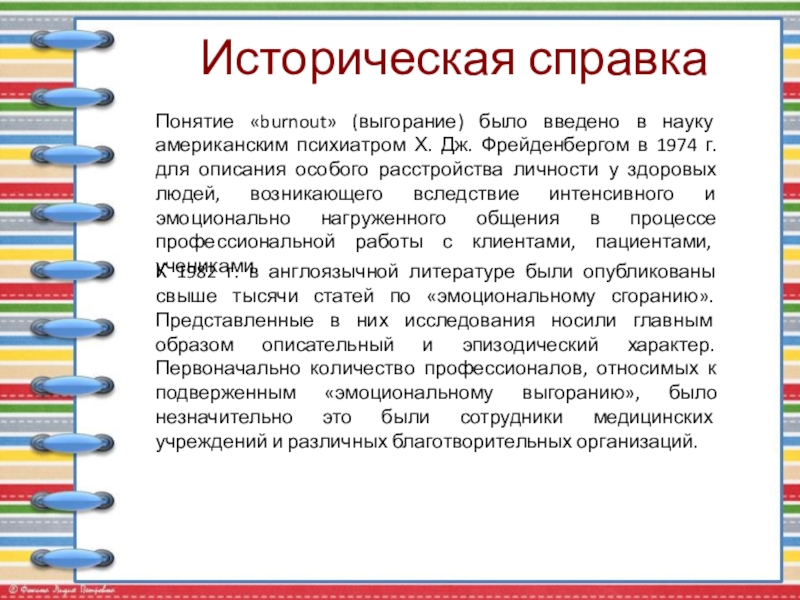 Понятие «burnout» (выгорание) было введено в науку американским психиатром Х.