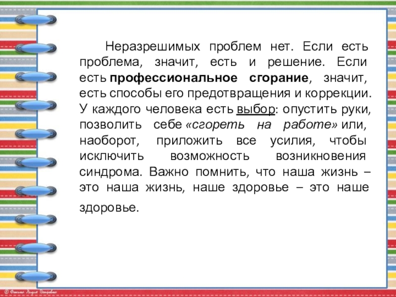 и решение. Если есть профессиональное сгорание, значит, есть способы его предотвращения и коррекции. У каждого человека есть выбор: опустить руки, позволить себе «сгореть на работе» или, наоборот, приложить все усилия, чтобы исключить возможность возникновения синдрома. Важно помнить, что наша жизнь – это наша жизнь, наше здоровье – это наше здоровье.