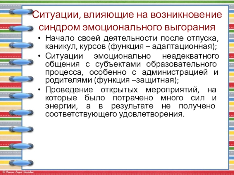 Слайд 10Ситуации, влияющие на возникновение синдром эмоционального выгорания