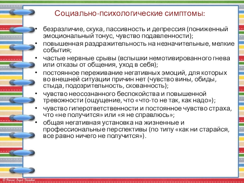 постоянное переживание негативных эмоций, для которых во внешней ситуации причин нет (чувство вины, обиды, стыда, подозрительность, скованность);