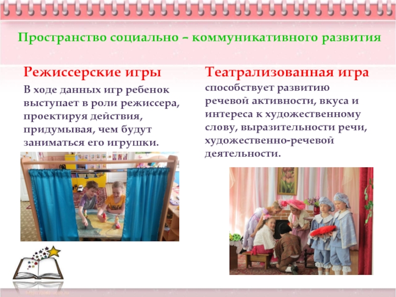 Театрализованная игра способствует развитию речевой активности, вкуса и интереса к художественному слову, выразительности речи, художественно-речевой деятельности.