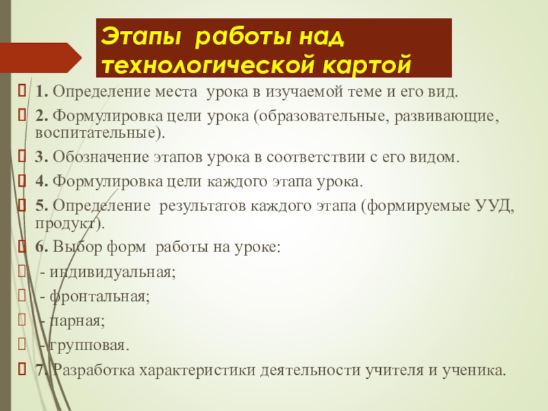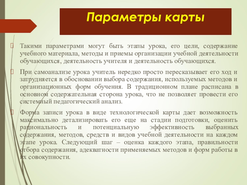 Форма записи урока в виде технологической карты дает возможность максимально детализировать его еще на стадии подготовки, оценить рациональность и потенциальную эффективность выбранных содержания, методов, средств и видов учебной деятельности на каждом этапе урока. Следующий шаг – оценка каждого этапа, правильности отбора содержания, адекватности применяемых методов и форм работы в их совокупности.