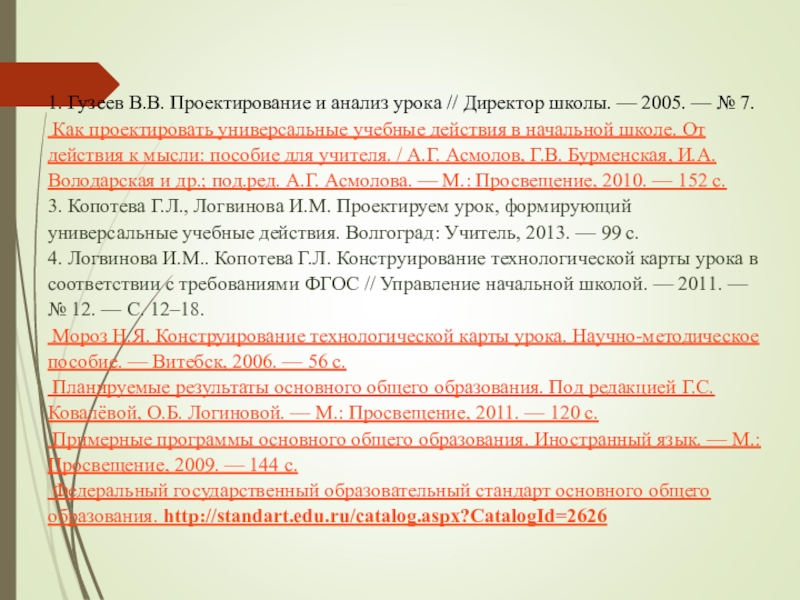3. Копотева Г.Л., Логвинова И.М. Проектируем урок, формирующий универсальные учебные действия. Волгоград: Учитель, 2013. — 99 с.