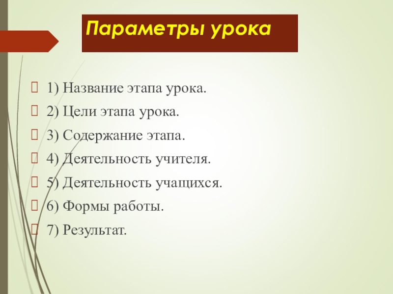 Такими параметрами могут быть этапы урока, его цели, содержание
