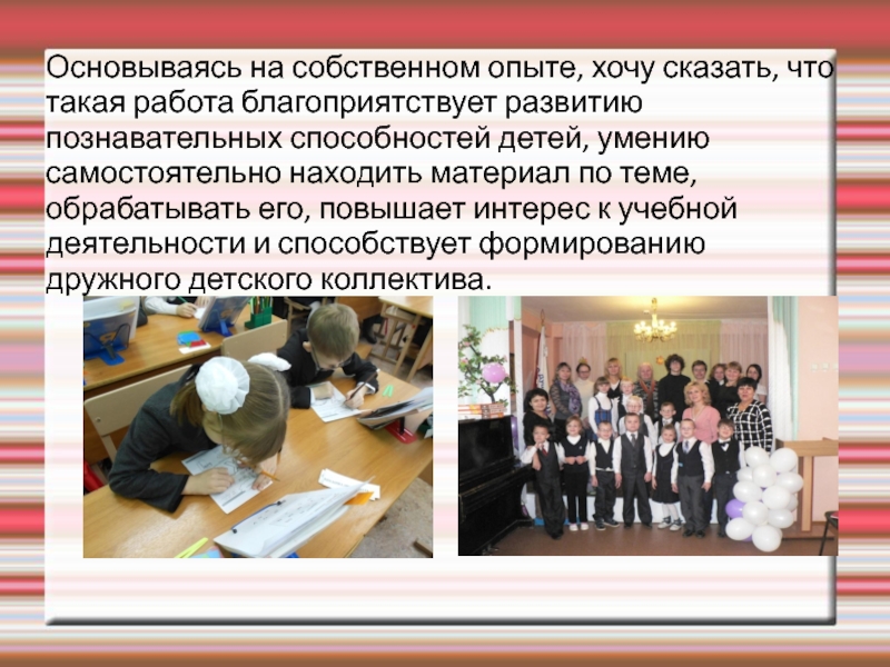 Слайд 23Основываясь на собственном опыте, хочу сказать, что такая работа благоприятствует развитию