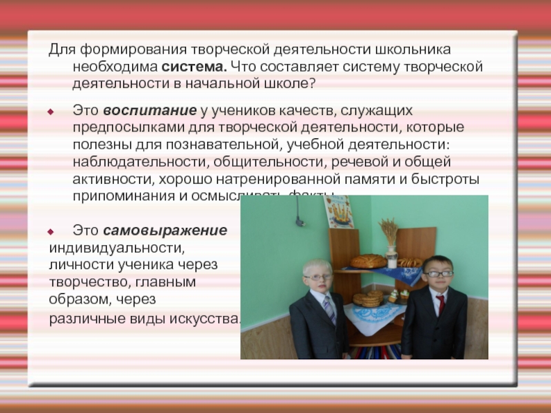 Слайд 6Для формирования творческой деятельности школьника необходима система. Что составляет систему творческой