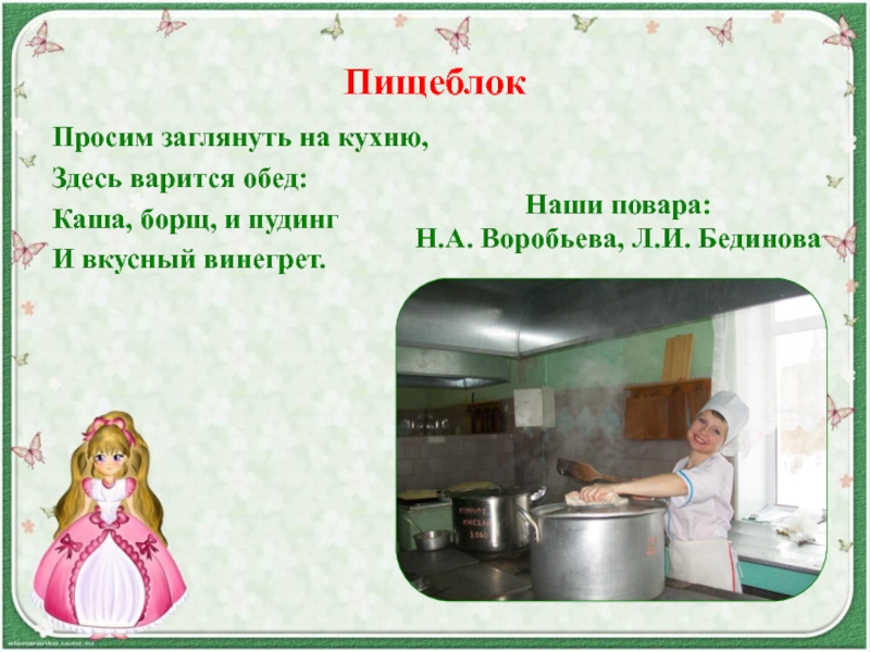 Продукты, поступающие на пищеблок дошкольного учреждения, имеют санитарно-эпидемиологические заключения; осуществляется контроль за технологией приготовления пищи, за реализацией скоропортящихся продуктов, и за реализацией продуктов по срокам их хранения.