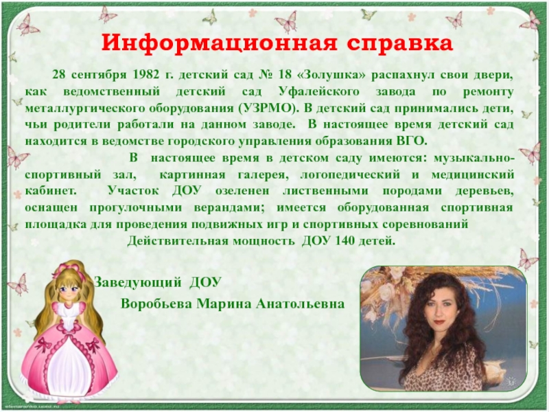 Григорьевна – бессменный заведующий детского сада на протяжении 20 лет. Человек творческий, бесконечно преданный своему делу, сплотивший вокруг себя замечательный, работоспособный, молодой, задорный коллектив.