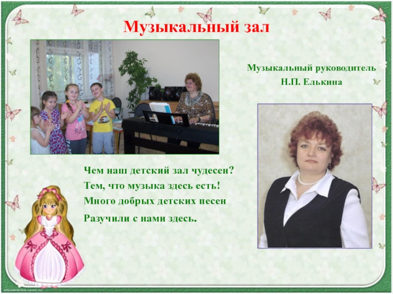 В настоящее время в детском саду имеются: музыкально-спортивный зал, картинная галерея, логопедический и медицинский кабинет. Участок ДОУ озеленен лиственными породами деревьев, оснащен прогулочными верандами; имеется оборудованная спортивная площадка для проведения подвижных игр и спортивных соревнований
