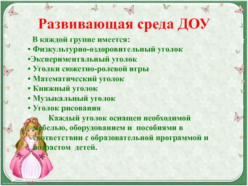 Каждый уголок оснащен необходимой мебелью, оборудованием и пособиями в соответствии с образовательной программой и возрастом детей.