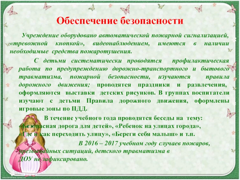 В 2016 – 2017 учебном году случаев пожаров, чрезвычайных ситуаций, детского травматизма в ДОУ не зафиксировано.