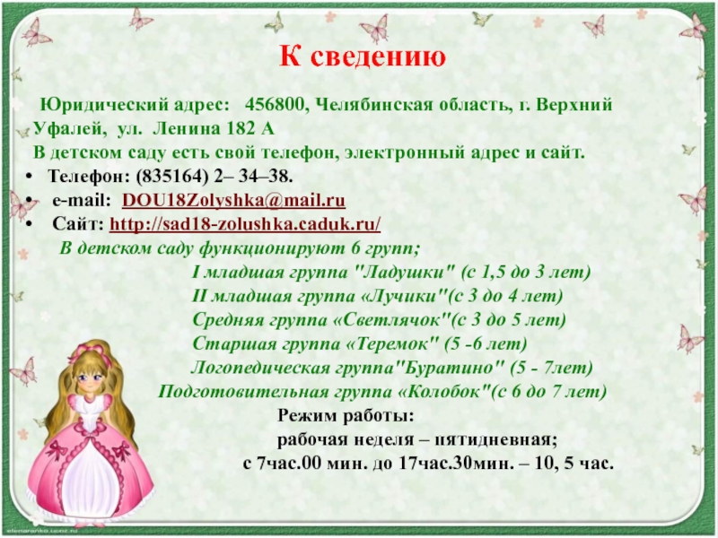 В детском саду есть свой телефон, электронный адрес и сайт.