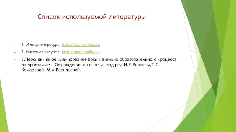 Список используемой литературы1. Интернет ресурс: http://dohcolonoc.ru2. Интернет ресурс : http://ped-kopilka.ru3.Перспективное планирование
