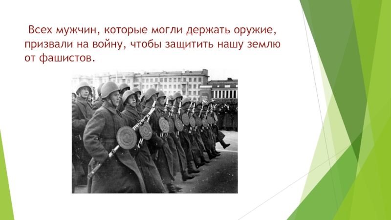 Слайд 3 Всех мужчин, которые могли держать оружие, призвали на войну, чтобы защитить