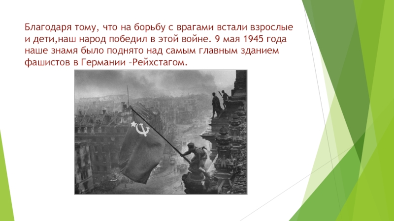 народ победил в этой войне. 9 мая 1945 года наше знамя было поднято над самым главным зданием фашистов в Германии –Рейхстагом.