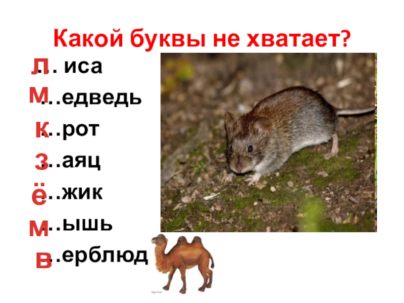 Какой буквы не хватает?  … иса  …едведь  …рот  …аяц  …жик  …ышь
