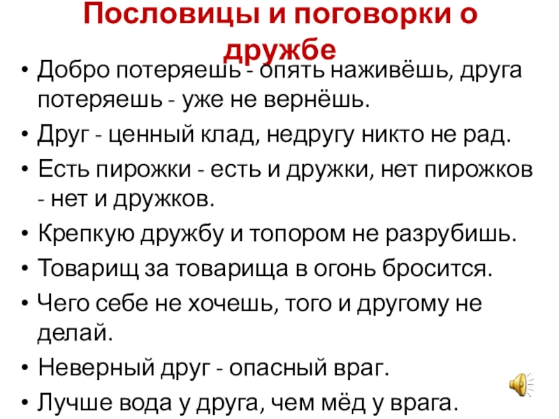 Пословицы и поговорки о дружбеДобро потеряешь - опять наживёшь, друга потеряешь - уже не вернёшь.Друг - ценный