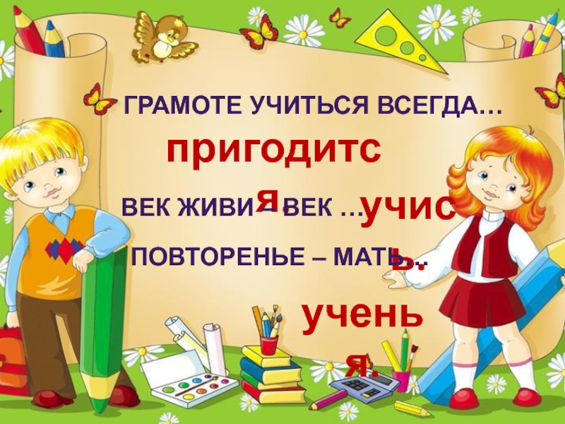 Грамоте учиться всегда…пригодится.Век живи – век …учись.Повторенье – мать… ученья.
