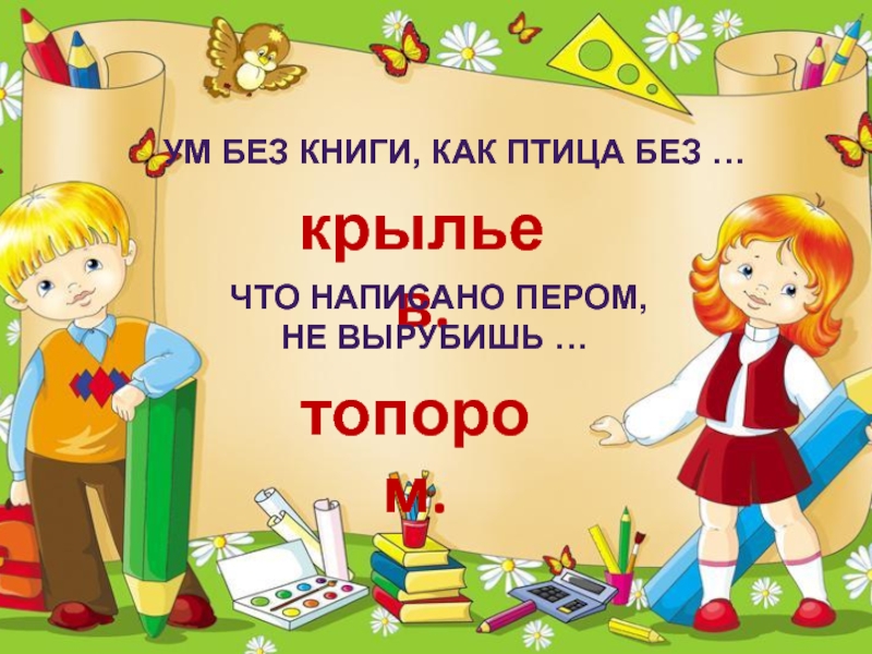 Ум без книги, как птица без …крыльев.Что написано пером, не вырубишь … топором.