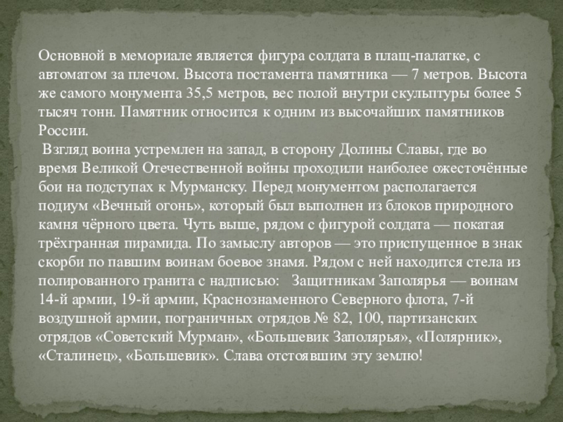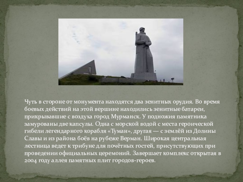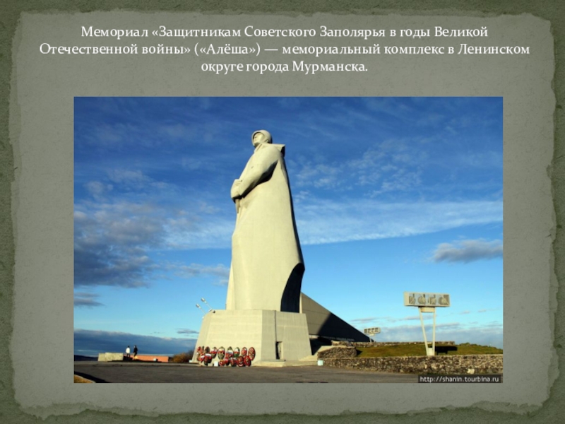Слайд 9Мемориал «Защитникам Советского Заполярья в годы Великой Отечественной войны» («Алёша») —