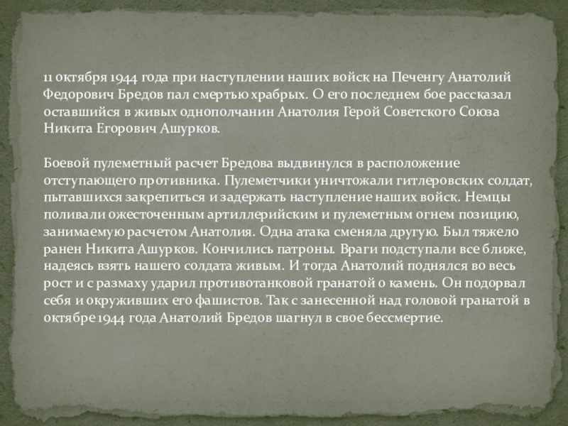 Слайд 1411 октября 1944 года при наступлении наших войск на Печенгу Анатолий