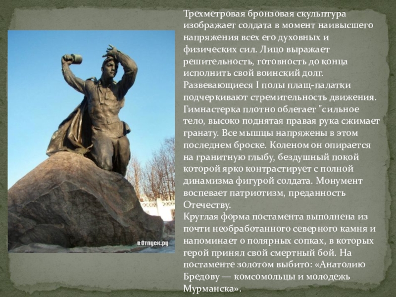 духовных и физических сил. Лицо выражает решительность, готовность до конца исполнить свой воинский долг. Развевающиеся I полы плащ-палатки подчеркивают стремительность движения. Гимнастерка плотно облегает "сильное тело, высоко поднятая правая рука сжимает гранату. Все мышцы напряжены в этом последнем броске. Коленом он опирается на гранитную глыбу, бездушный покой которой ярко контрастирует с полной динамизма фигурой солдата. Монумент воспевает патриотизм, преданность Отечеству.