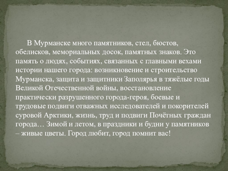 Это память о людях, событиях, связанных с главными вехами истории нашего города: возникновение и строительство Мурманска, защита и защитники Заполярья в тяжёлые годы Великой Отечественной войны, восстановление практически разрушенного города-героя, боевые и трудовые подвиги отважных исследователей и покорителей суровой Арктики, жизнь, труд и подвиги Почётных граждан города… Зимой и летом, в праздники и будни у памятников – живые цветы. Город любит, город помнит вас!