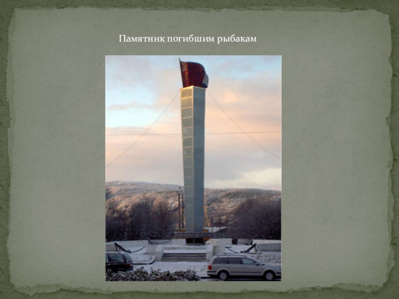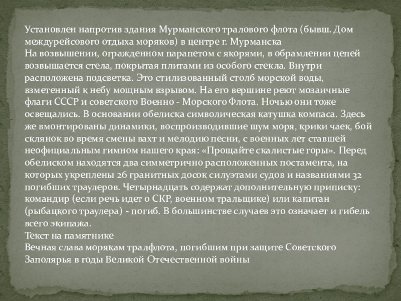 Слайд 4Установлен напротив здания Мурманского тралового флота (бывш. Дом междурейсового отдыха моряков)