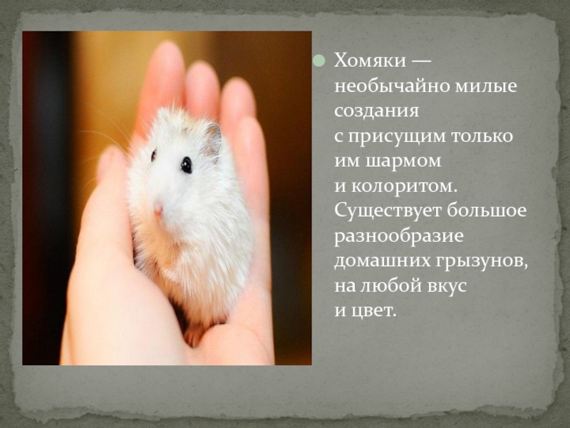 Слайд 8Хомяки — необычайно милые создания с присущим только им шармом и колоритом. Существует большое разнообразие