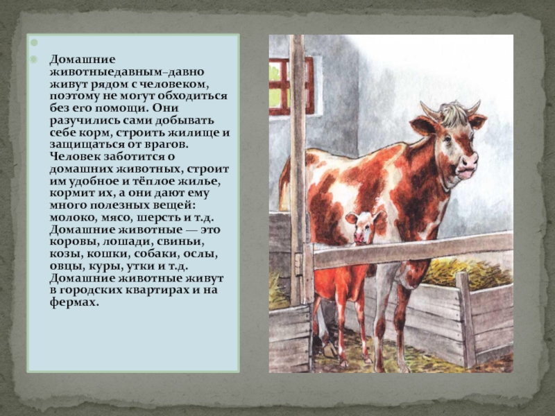его помощи. Они разучились сами добывать себе корм, строить жилище и защищаться от врагов.Человек заботится о домашних животных, строит им удобное и тёплое жилье, кормит их, а они дают ему много полезных вещей: молоко, мясо, шерсть и т.д.Домашние животные — это коровы, лошади, свиньи, козы, кошки, собаки, ослы, овцы, куры, утки и т.д.Домашние животные живут в городских квартирах и на фермах.