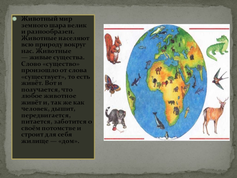 Животный мир земного шара велик и разнообразен. Животные населяют всю природу вокруг нас. Животные — живые существа. Слово «существо»