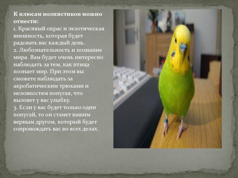 Слайд 7К плюсам волнистиков можно отнести: 1. Красивый окрас и экзотическая внешность, которая