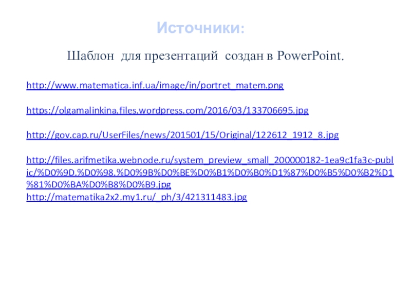 Источники:Шаблон для презентаций создан в PowerPoint.http://www.matematica.inf.ua/image/in/portret_matem.pnghttps://olgamalinkina.files.wordpress.com/2016/03/133706695.jpghttp://gov.cap.ru/UserFiles/news/201501/15/Original/122612_1912_8.jpghttp://files.arifmetika.webnode.ru/system_preview_small_200000182-1ea9c1fa3c-public/%D0%9D.%D0%98.%D0%9B%D0%BE%D0%B1%D0%B0%D1%87%D0%B5%D0%B2%D1%81%D0%BA%D0%B8%D0%B9.jpghttp://matematika2x2.my1.ru/_ph/3/421311483.jpg