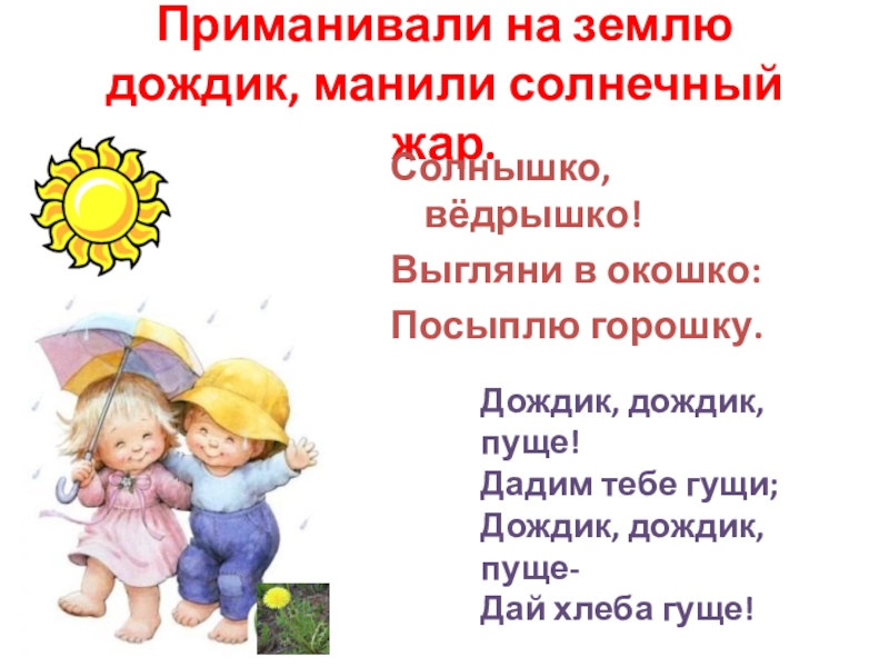 Приманивали на землю дождик, манили солнечный жар.Солнышко, вёдрышко!Выгляни в окошко:Посыплю горошку.Дождик, дождик, пуще!Дадим тебе гущи;Дождик, дождик, пуще-Дай