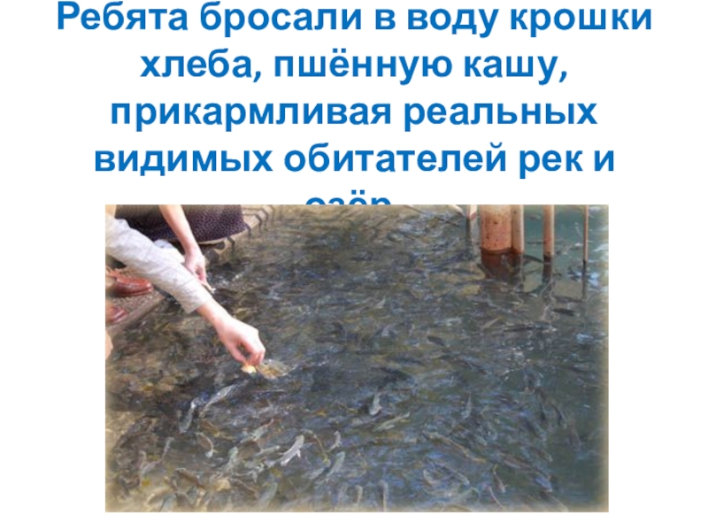 Слайд 13Ребята бросали в воду крошки хлеба, пшённую кашу, прикармливая реальных видимых
