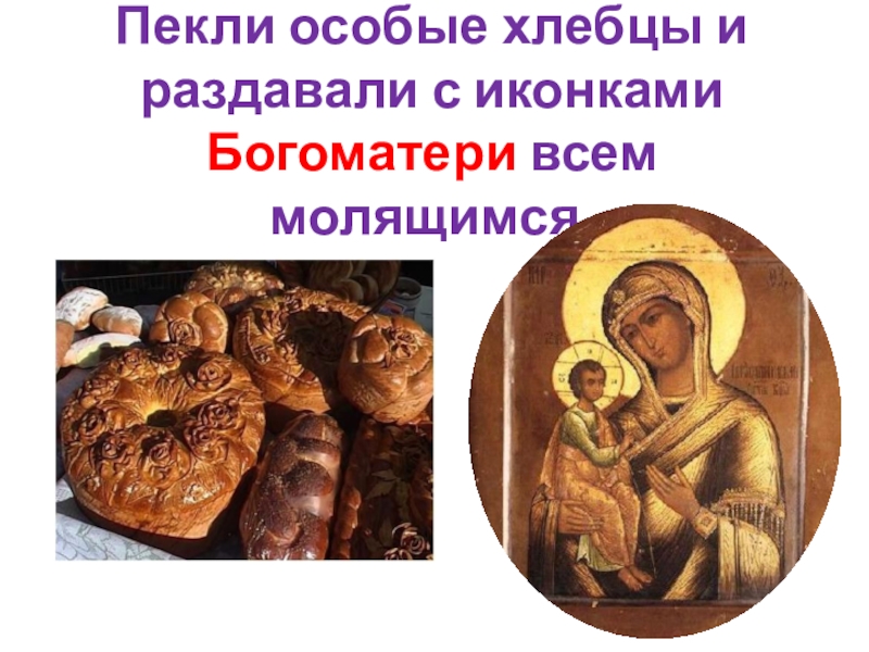 Слайд 8Пекли особые хлебцы и раздавали с иконками Богоматери всем молящимся.